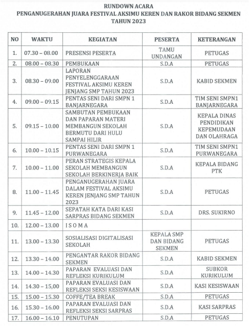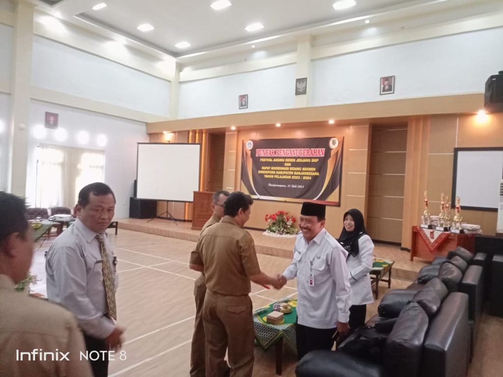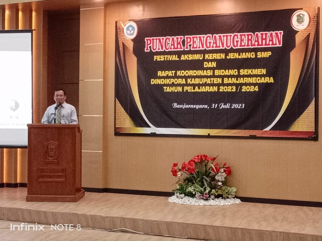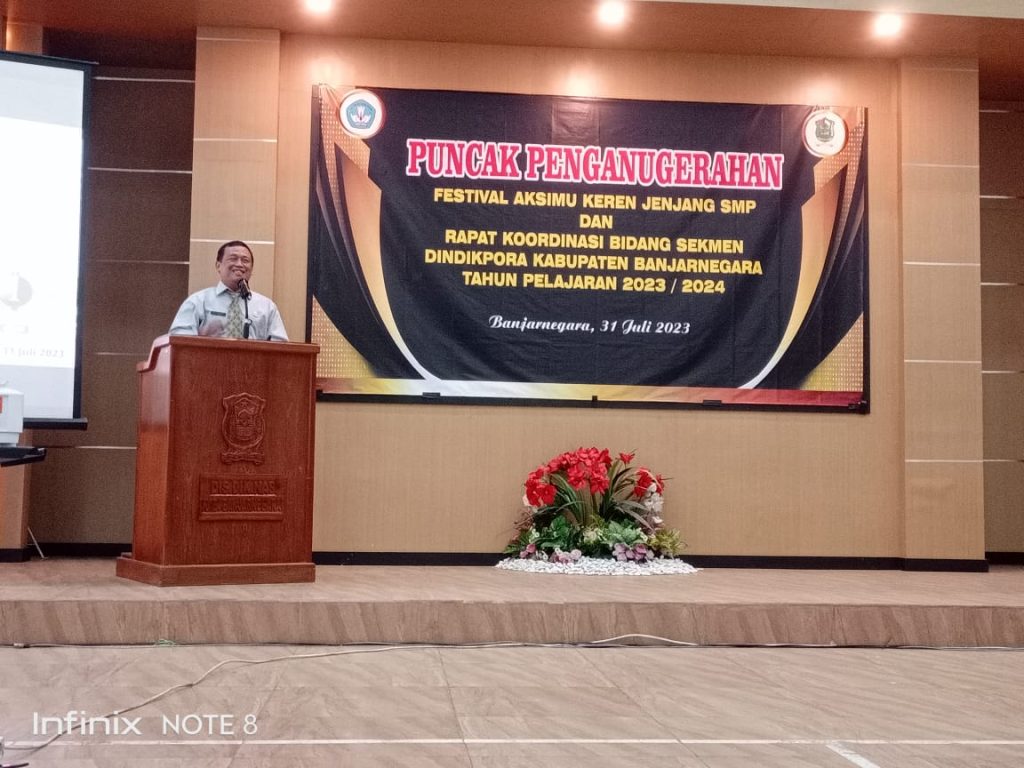 Hari ini, Senin 31 Juli 2023 dilaksanakan pemberian aprisiasi bagi sekolah berkinerja baik dan koordinasi program kerja Semester Gasal Tahun Pelajaran 2023/2024 Bidang Sekolah Menengah Dindikpora menyelenggarakan puncak pengaugrahan “FESTIVAL AKSIMU KEREN” jenjang SMP dan Rapat Koordinasi Bidang Sekmen di Aula Ki Hajar Dewantara Gedung A Lantai III Dindikpora Kab. Banjarnegara.
