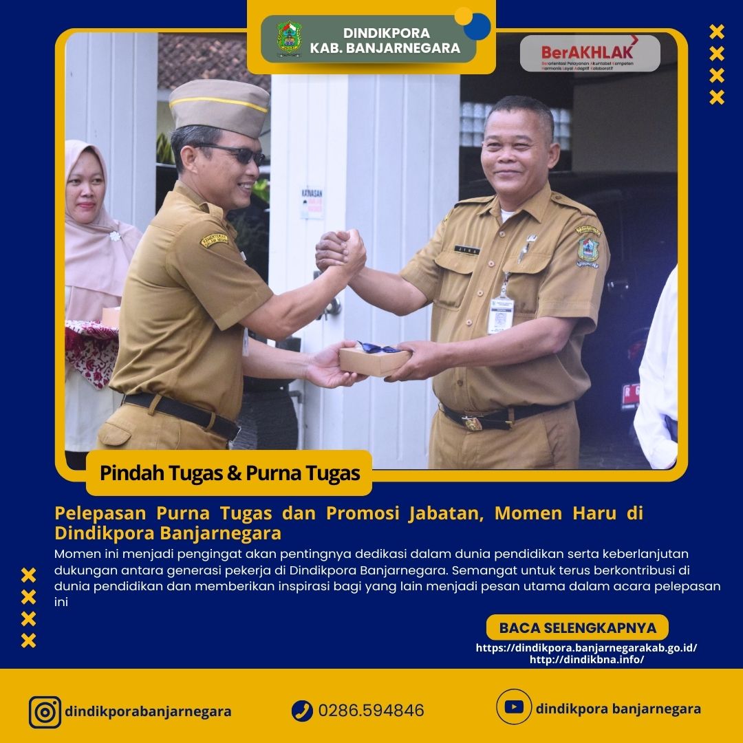 Momen ini menjadi pengingat akan pentingnya dedikasi dalam dunia pendidikan serta keberlanjutan dukungan antara generasi pekerja di Dindikpora Banjarnegara. Semangat untuk terus berkontribusi di dunia pendidikan dan memberikan inspirasi bagi yang lain menjadi pesan utama dalam acara pelepasan ini.Acara diakhiri dengan suasana haru dan penuh kebersamaan, sebagai penghormatan atas jasa-jasa mereka yang telah berkontribusi besar di Dindikpora Banjarnegara.